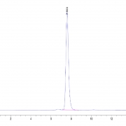 The protein has a predicted MW of 75.67 kDa. Due to glycosylation, the protein migrates to 90-110 kDa based on Tris-Bis PAGE result.