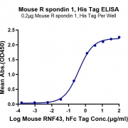 Immobilized Mouse R spondin 1, His Tag at 2ug/ml (100ul/Well) on the plate. Dose response curve for Mouse RNF43, hFc Tag with the EC50 of 0.40ug/ml determined by ELISA. See testing image for detail.