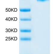 The protein has a predicted MW of 50.3 kDa. Due to glycosylation, the protein migrates to 60-70 kDa based on Tris-Bis PAGE result.