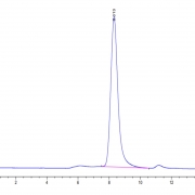 The protein has a predicted MW of 34.2 kDa. Due to glycosylation, the protein migrates to 55-70 kDa based on Tris-Bis PAGE result.
