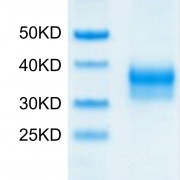 The protein has a predicted MW of 26.7 kDa. Due to glycosylation, the protein migrates to 30-40 kDa based on Tris-Bis PAGE result.
