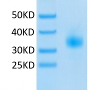 The protein has a predicted MW of 22 kDa. Due to glycosylation,the protein migrates to 30-40 kDa based on Tris-Bis PAGE result.