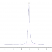 The protein has a predicted MW of 31.8 kDa. Due to glycosylation, the protein migrates to 50-60 kDa based on Tris-Bis PAGE result.