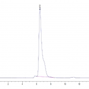The protein has a predicted MW of 73.6 kDa. Due to glycosylation, the protein migrates to 75-140 kDa based on Tris-Bis PAGE result.