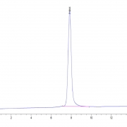 The protein has a predicted MW of 46.38 kDa. Due to glycosylation, the protein migrates to 55-65 kDa based on Tris-Bis PAGE result.