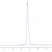 The protein has a predicted MW of 28.8 kDa. Due to glycosylation, the protein migrates to 48-55 kDa based on Tris-Bis PAGE result.