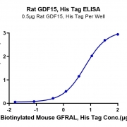 Immobilized Rat GDF15, His Tag at 5ug/ml (100ul/Well) on the plate. Dose response curve for Biotinylated Mouse GFRAL, His Tag with the EC50 of 6.2ug/ml determined by ELISA. See testing image for detail.