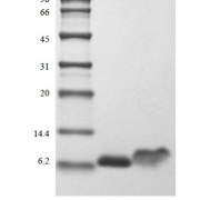 We recommend that this vial be briefly centrifuged prior to opening to bring the contents to the bottom. Reconstitute in sterile distilled water or aqueous buffer containing 0.1 % BSA to a concentration of 0.1-1.0 mg/mL. Stock solutions should be apportioned into working aliquots and stored at ≤ -20 °C. Further dilutions should be made in appropriate buffered solutions.