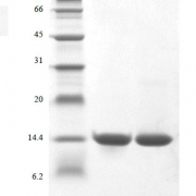 Migration Inhibitory Factor (MIF) is a secreted protein without a cleavable signal sequence and is secreted via a specialized, nonclassicalpathway. It is secreted by macrophages upon stimulation by bacterial lipopolysaccharide (LPS), or by M.tuberculosis antigens. MIF consists of two alpha-helices and six beta-strands, four of which form a beta-sheet. The two remaining beta-strands interact with other MIF molecules, creating a trimer. Structure-function studies suggest MIF is bifunctional with segregated topology.The N- and C-termini mediate enzyme activity (in theory). Phenylpyruvate tautomerase activity (enol-to-keto) has been demonstrated and is dependent upon Pro at position 1. Amino acids 50-65(a.a.) have also been suggested to contain thiol-protein oxidoreductase activity. MIF has proinflammatory cytokine activity centered around 49 – 65(a.a.). On fibroblasts, MIF induces, IL-1, IL-8 and MMP expression; on macrophages, MIF stimulates NO production and TNF-alpha release folllowing IFN-gamma activation. MIF apparently acts through CD74 and CD44, likely in some form of trimeric interaction. Human MIF is active on mouse cells. Human MIF is 90 %, 94 %, 95 %, and 90 % a.a. identical to mouse, bovine, porcine and rat MIF, respectively.