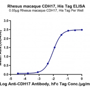 Immobilized Rhesus macaque CDH17, His Tag at 0.5ug/ml (100ul/well) on the plate. Dose response curve for Anti-CDH17 Antibody, hFc Tag with the EC50 of 9.5ng/ml determined by ELISA. See testing image for detail.