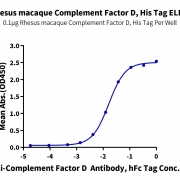 Immobilized Rhesus macaque Complement Factor D, His Tag at 1ug/ml (100ul/well) on the plate. Dose response curve for Anti-Complement Factor D Antibody, hFc Tag with the EC50 of 16.3ng/ml determined by ELISA. See testing image for detail.