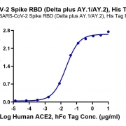 Immobilized SARS-CoV-2 Spike RBD, His Tag (Delta plus AY.1/AY.2) at 0.5ug/ml (100ul/Well) on the plate. Dose response curve for Human ACE2, hFc Tag with the EC50 of 21ng/ml determined by ELISA. See testing image for detail.