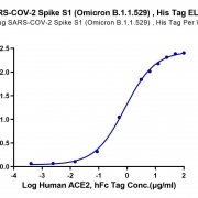Immobilized Human ACE2, hFc Tag at 2ug/ml (100ul/well) on the plate. Dose response curve for SARS-COV-2 Spike S1 (Omicron B.1.1.529) , His Tag with the EC50 of 0.8ug/ml determined by ELISA. See testing image for detail.