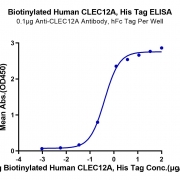 Immobilized Anti-CLEC12A Antibody, hFc Tag at 1ug/ml (100ul/well) on the plate. Dose response curve for Biotinylated Human CLEC12A, His Tag with the EC50 of 0.41ug/ml determined by ELISA. See testing image for detail.