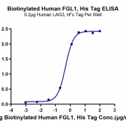 Immobilized Human LAG3, hFc Tag at 2ug/ml (100ul/well) on the plate. Dose response curve for Biotinylated Human FGL1, His Tag with the EC50 of 0.48ug/ml determined by ELISA. See testing image for detail.