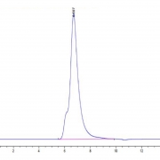 The protein has a predicted MW of 39.9 kDa. Due to glycosylation, the protein migrates to 58-70 kDa based on Tris-Bis PAGE result.