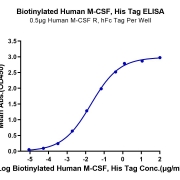Immobilized Human M-CSF R, hFc Tag at 5ug/ml (100ul/well) on the plate. Dose response curve for Biotinylated Human M-CSF, His Tag with the EC50 of 19.4ng/ml determined by ELISA. See testing image for detail.