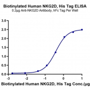 Immobilized Anti-NKG2D Antibody at 2ug/ml (100ul/well) on the plate. Dose response curve for Biotinylated Human NKG2D, His Tag with the EC50 of 0.39ug/ml determined by ELISA. See testing image for detail.