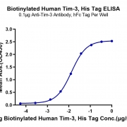 Immobilized Anti-Tim-3 Antibody, hFc Tag at 1ug/ml (100ul/well) on the plate. Dose response curve for Biotinylated Human Tim-3, His Tag with the EC50 of 13.2ng/ml determined by ELISA. See testing image for detail.
