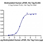 Immobilized Human PLAU, His Tag at 1ug/ml (100ul/well) on the plate. Dose response curve for Biotinylated Human uPAR, His Tag with the EC50 of 13.4ng/ml determined by ELISA. See testing image for detail.