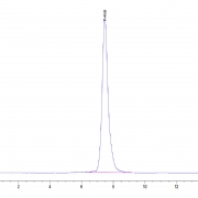 The protein has a predicted MW of 53.89 kDa. Due to glycosylation, the protein migrates to 65-70 kDa based on Tris-Bis PAGE result.
