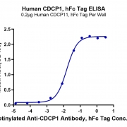 Immobilized Human CDCP1, hFc Tag at 2ug/ml (100ul/Well) on the plate. Dose response curve for Biotinylated Anti-CDCP1 Antibody, hFc Tag with the EC50 of 15.5ng/ml determined by ELISA. See testing image for detail.