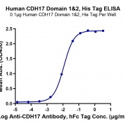 Immobilized Human CDH17 Domain 1&2, His Tag at 1ug/ml (100ul/well) on the plate. Dose response curve for Anti-CDH17 Antibody, hFc Tag with the EC50 of 11.4ng/ml determined by ELISA. See testing image for detail.