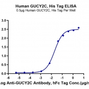 Immobilized Human GUCY2C, His Tag at 5ug/ml (100ul/well) on the plate. Dose response curve for Anti-GUCY2C Antibody, hFc Tag with the EC50 of 21.4ng/ml determined by ELISA. See testing image for detail.