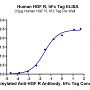 Immobilized Human HGF R, hFc Tag at 5ug/ml (100ul/Well) on the plate. Dose response curve for Biotinylated Anti-HGF R Antibody, hFc Tag with the EC50 of 26.7ng/ml determined by ELISA (QC Test). See testing image for detail.