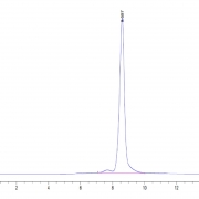 The protein has a predicted MW of 50.2 kDa. Due to glycosylation, the protein migrates to 52-62 kDa based on Tris-Bis PAGE result.