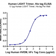 Immobilized Human LIGHT Trimer, His tag at 1ug/ml (100ul/well) on the plate. Dose response curve for Human HVEM, hFc Tag with the EC50 of 37.5ng/ml determined by ELISA. See testing image for detail.