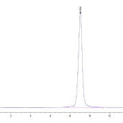 The protein has a predicted MW of 52.3 kDa. Due to glycosylation, the protein migrates to 65-70 kDa based on Tris-Bis PAGE result.
