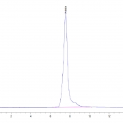 The protein has a predicted MW of 46.8 kDa. Due to glycosylation, the protein migrates to 65-68 kDa based on Tris-Bis PAGE result.